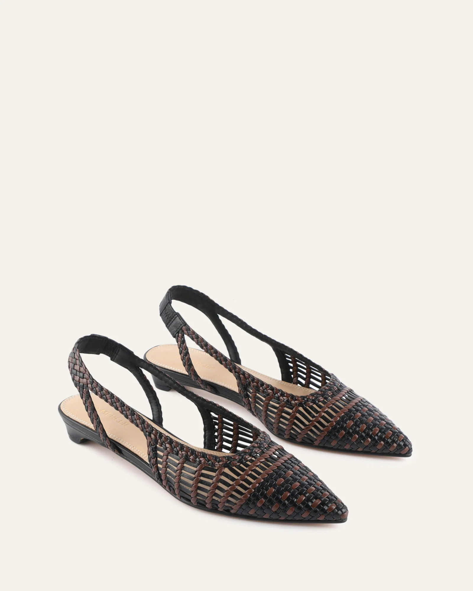 AUBREY is a refined slingback crafted from intricately woven kid leather, offering a textural twist on a timeless silhouette. Finished with a pointed toe and sculpted wedge heel on a natural resin sole.
