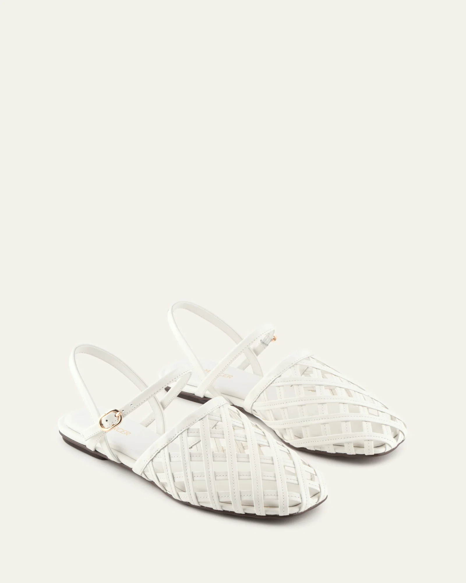 Meet EROS, the perfect everyday elevated casual flat. Featuring a softly squared toe and caged crinkle goat leather upper, its finished with a soft gold buckle, adjustable front strap and supportive heel strap.