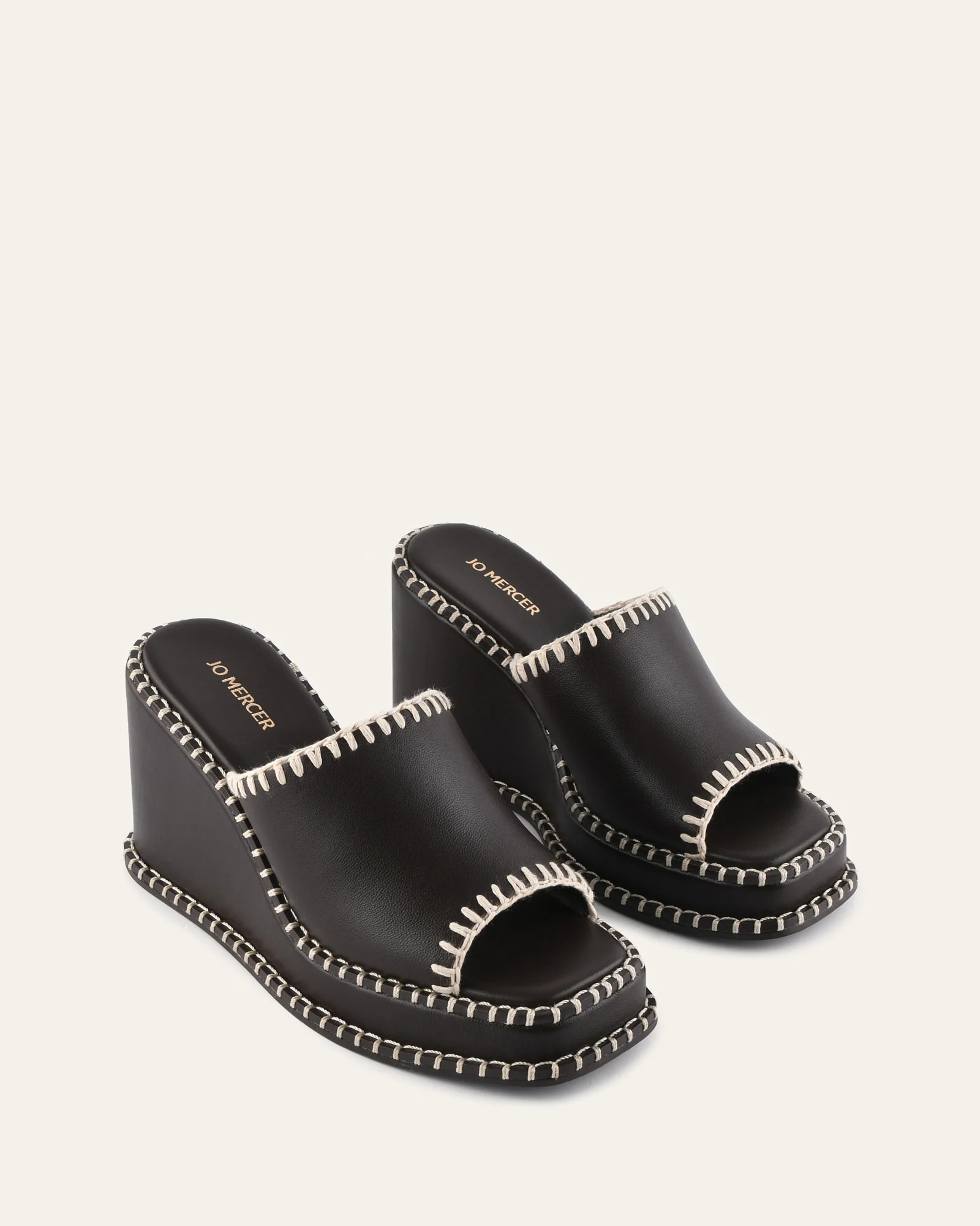 FRANKIE is a high wedge mule crafted from smooth kid leather, elevated with decorative blanket stitch detailing for a handcrafted touch. Featuring a platform wedge with a natural sueded resin sole and a softly squared toe, it delivers height with effortless comfort.