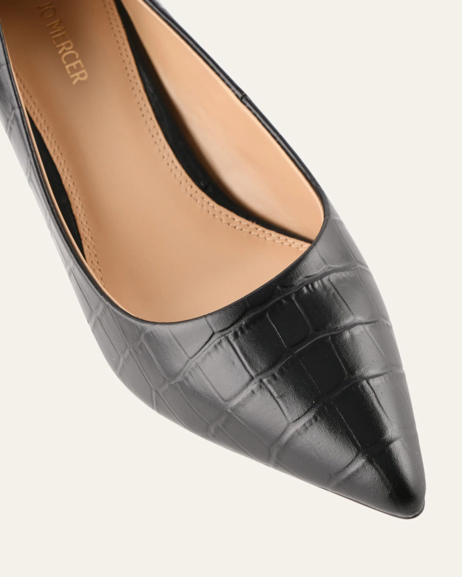 GESSO combines timeless structure with bold texture. Featuring a pointed toe and embossed croc leather finish, its sleek block heel offers stability and style for effortless everyday wear.