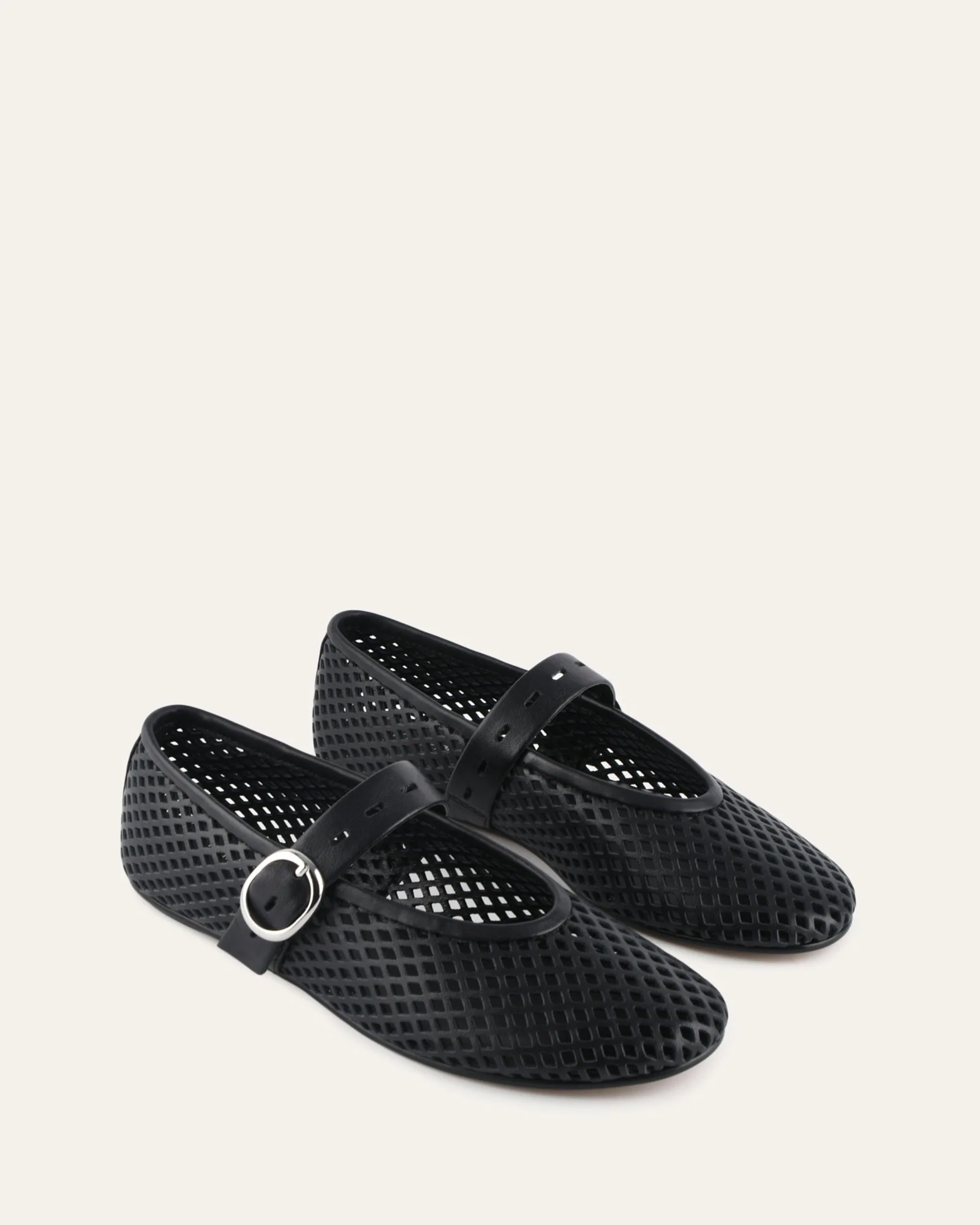 Add texture to your outfit with GINGER, A modern take on a classic, this Mary-Jane ballet flat features perforated cow leather with a lasercut mesh effect, finished with refined French binding. Designed with a rounded toe, wide strap, and shiny silver circle buckle, it’s set on a sueded resin sole with a black rubber heel tip for added comfort and durability.