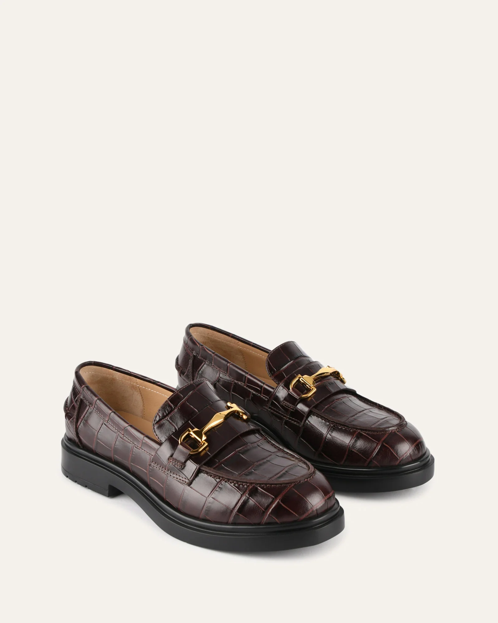 Meet JULIO, a lightweight chunky loafer crafted from croc embossed leather, featuring classic penny loafer detailing with an almond toe and trim accents. Finished with old gold hardware and an EVA rubber outsole, perfect for any staple wardrobe.