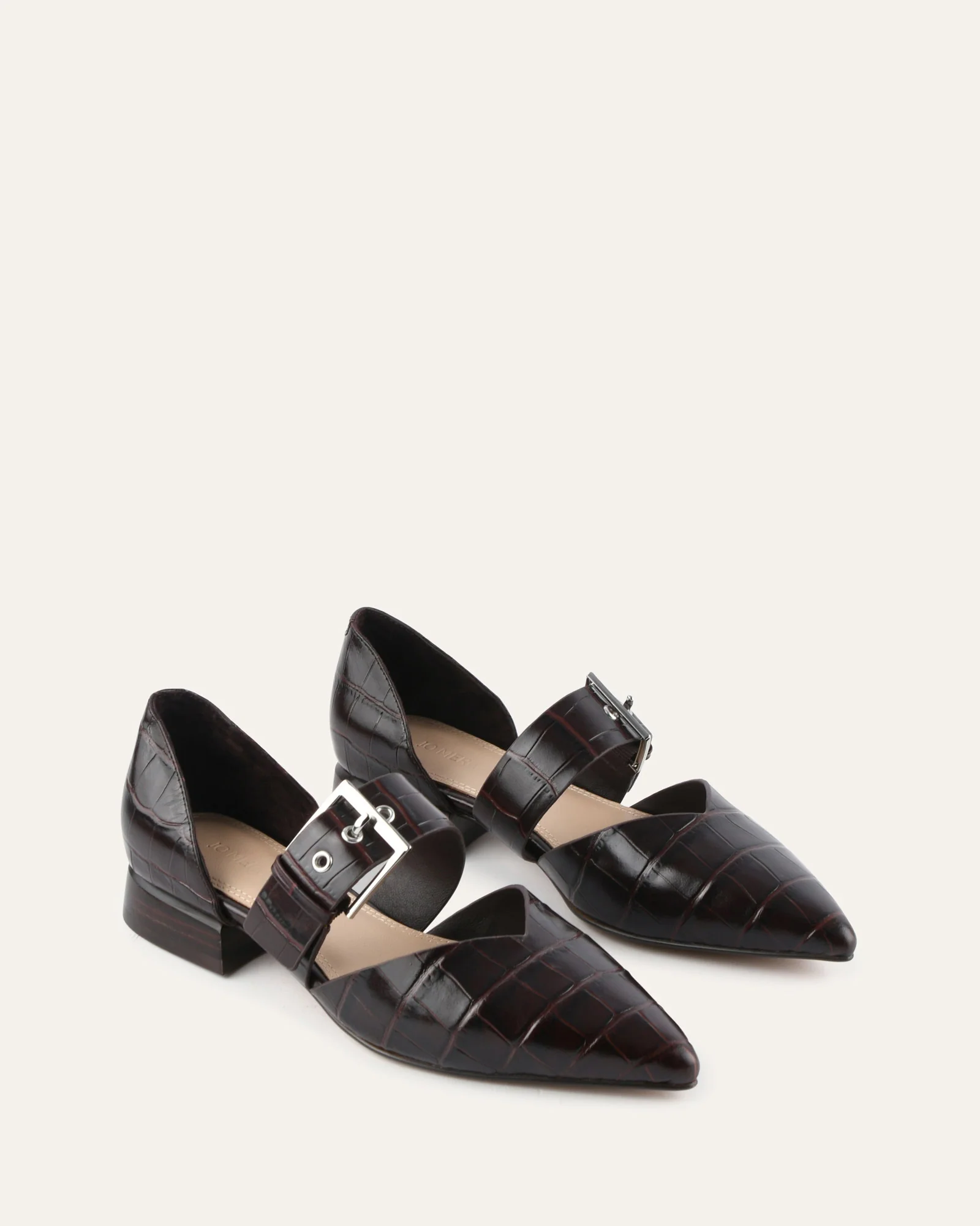 NEELA features a sharp pointed toe and a flared heel for a chic silhouette. Crafted from croc embossed leather with a natural resin sole, it includes a Mary-Jane strap with a large square buckle, metal eyelets, and soft gold hardware.