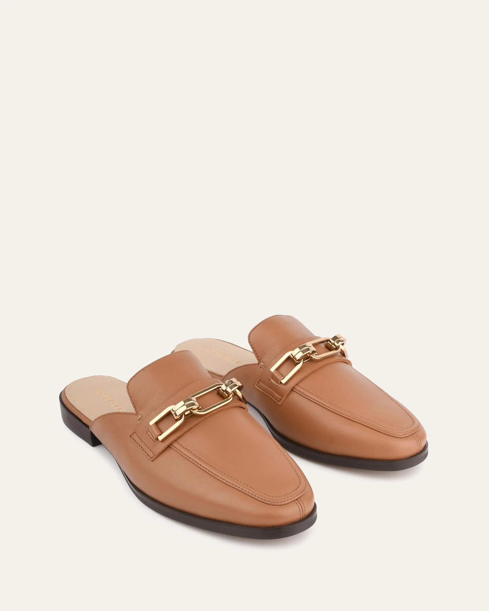 - Backless mule loafer with soft gold trim on vamp